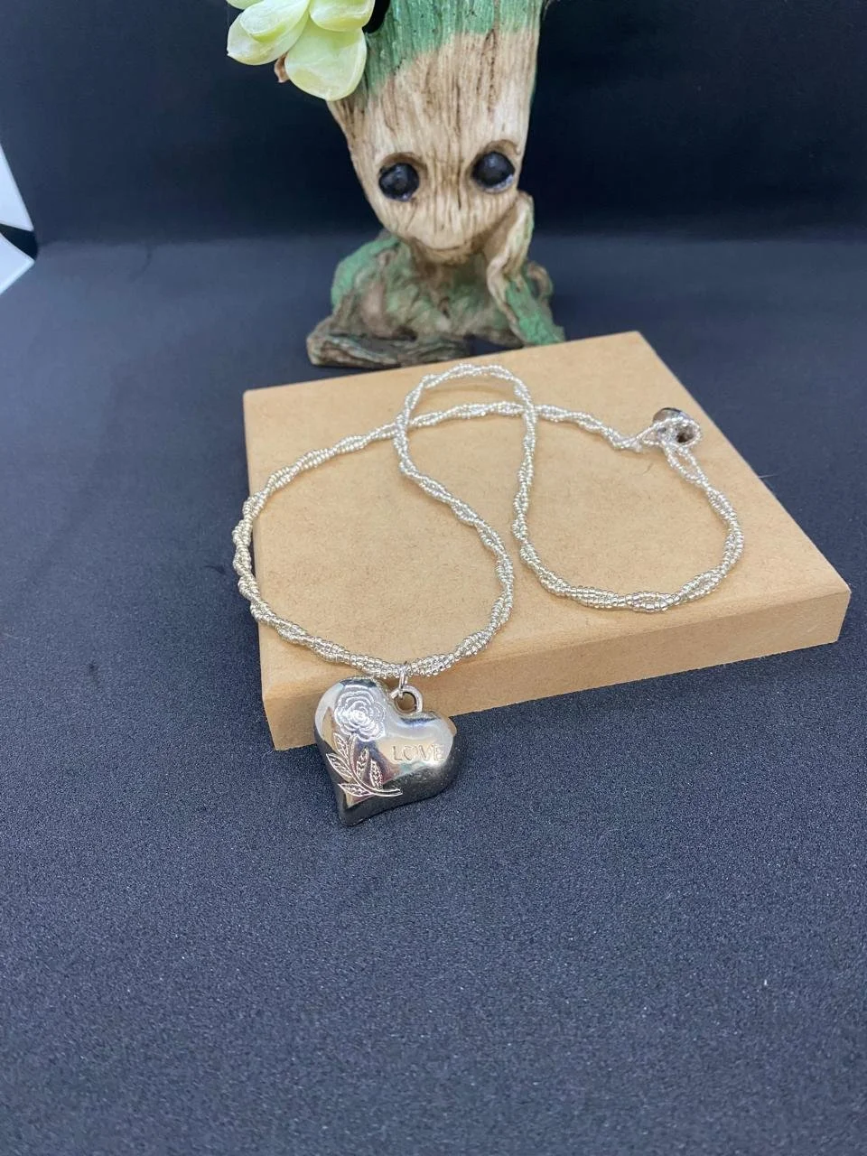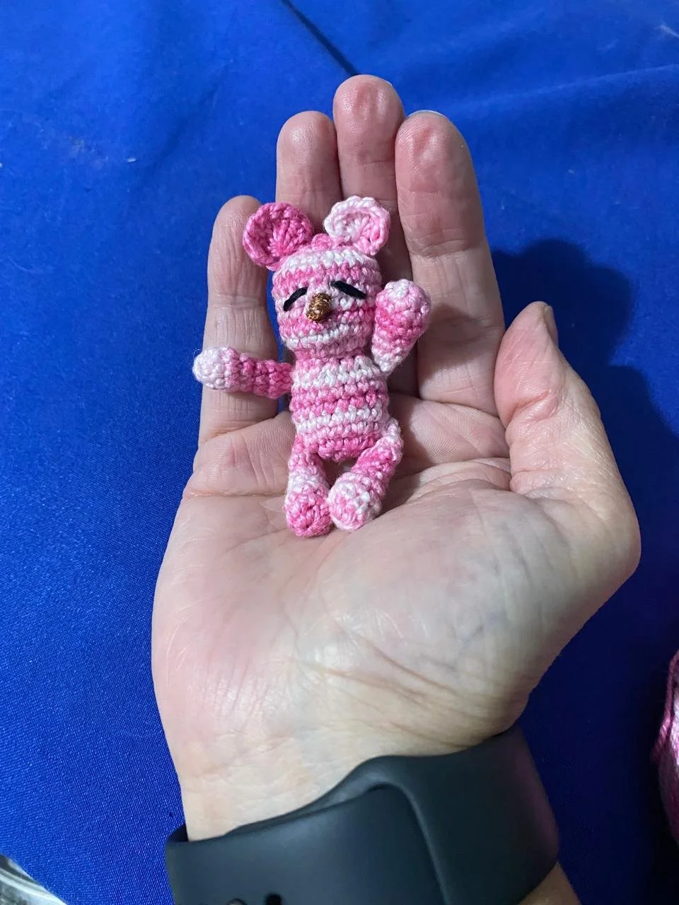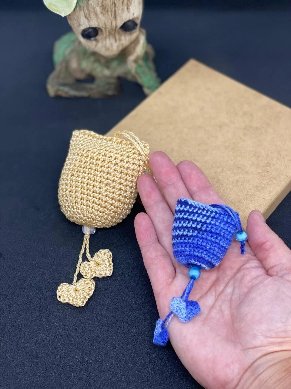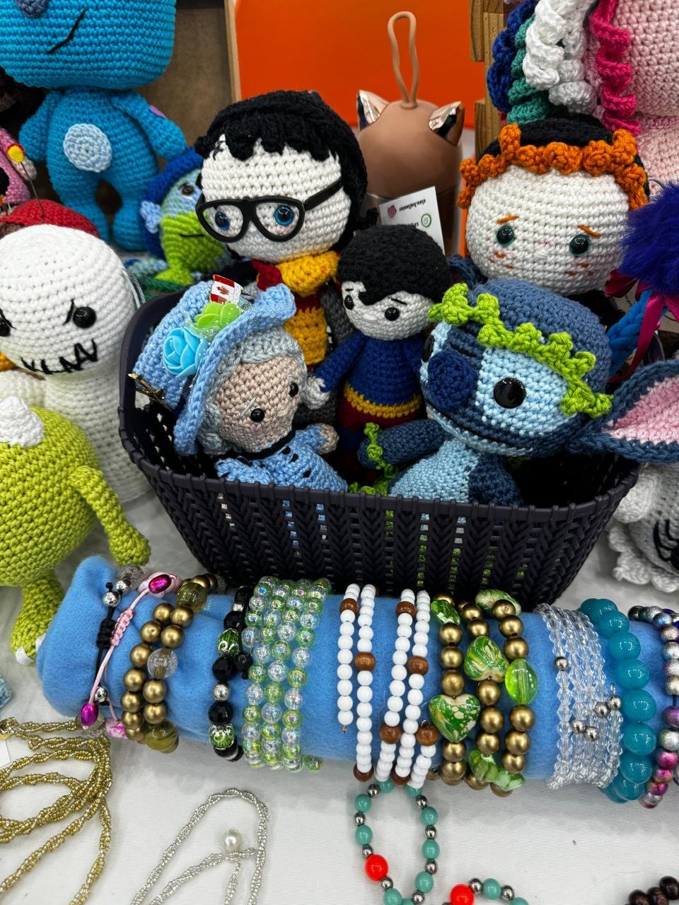 Bonecos de crochê de personagens de desenhos animados e roupas de seguros de contas de várias cores em exibição.