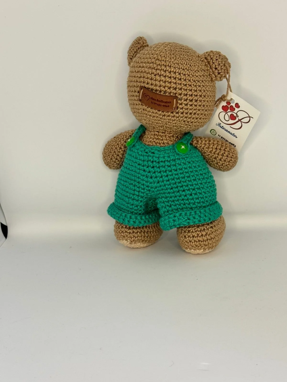 🐻 Que fofura! Apresentamos o nosso adorável Ursinho Amigurumi de Macacão Verde, feito com todo o carinho em crochê para encantar corações! Este ursinho charmoso veste um lindo macacão verde com botões e carrega um pequeno coração vermelho no peito, simbolizando todo o afeto que ele trará para seu novo lar. Perfeito para presentear, decorar o quarto dos pequenos ou alegrar qualquer ambiente com sua doçura.