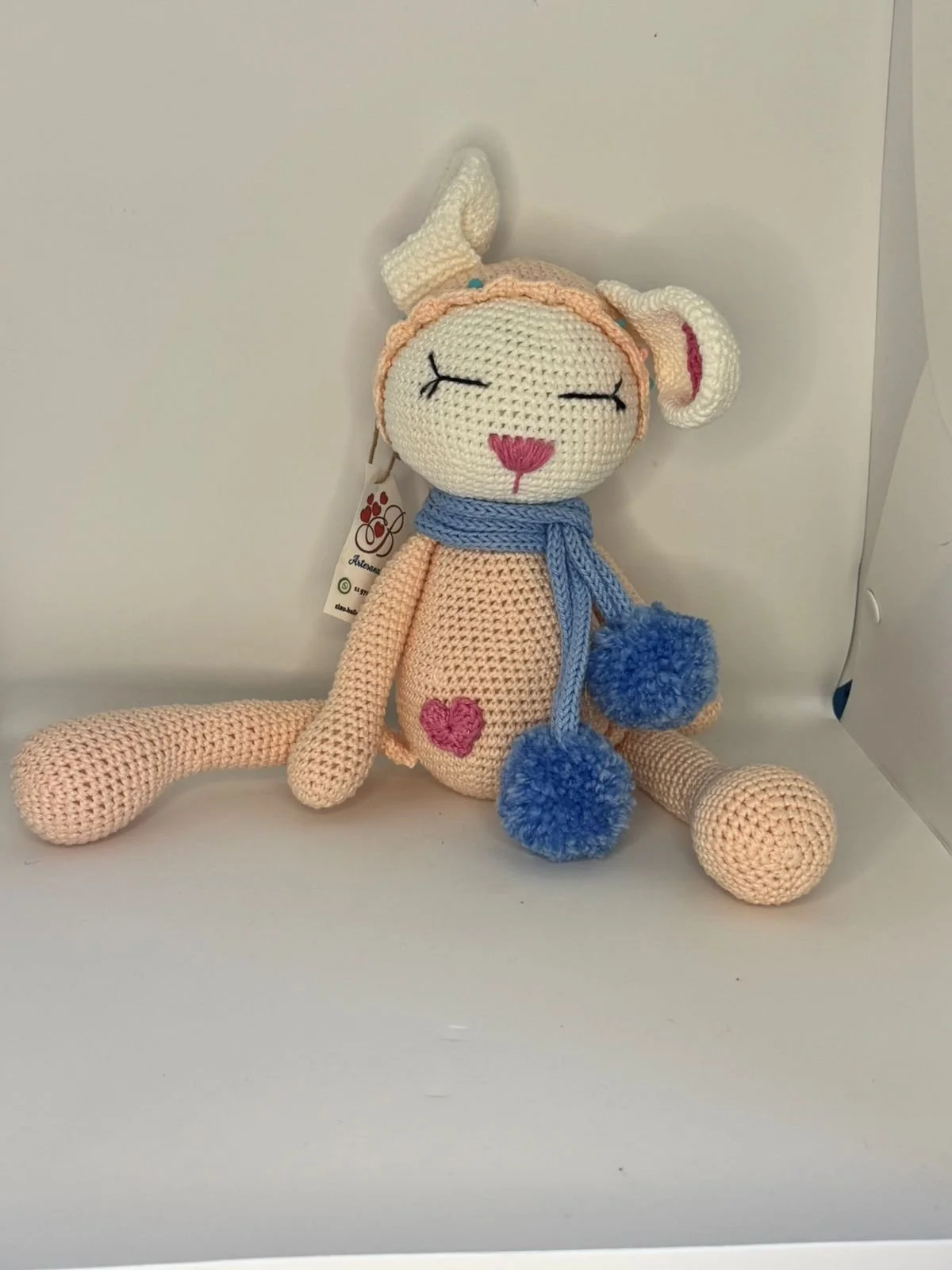 ✨ Detalhes que encantam: Feita com fio de algodão macio e enchimento antialérgico. Cachecol azul com pompons para um charme extra. Detalhe de coração rosa bordado no corpinho. Ideal para todas as idades.